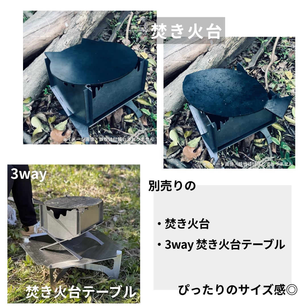 板厚は4.5mmの黒皮鉄を使用。直火にも負けず、均一に熱が通るので、アウトドアや家庭の鉄板料理に最適。使い込むほどに表情が変わっていくのも、黒皮鉄ならではの楽しさです。